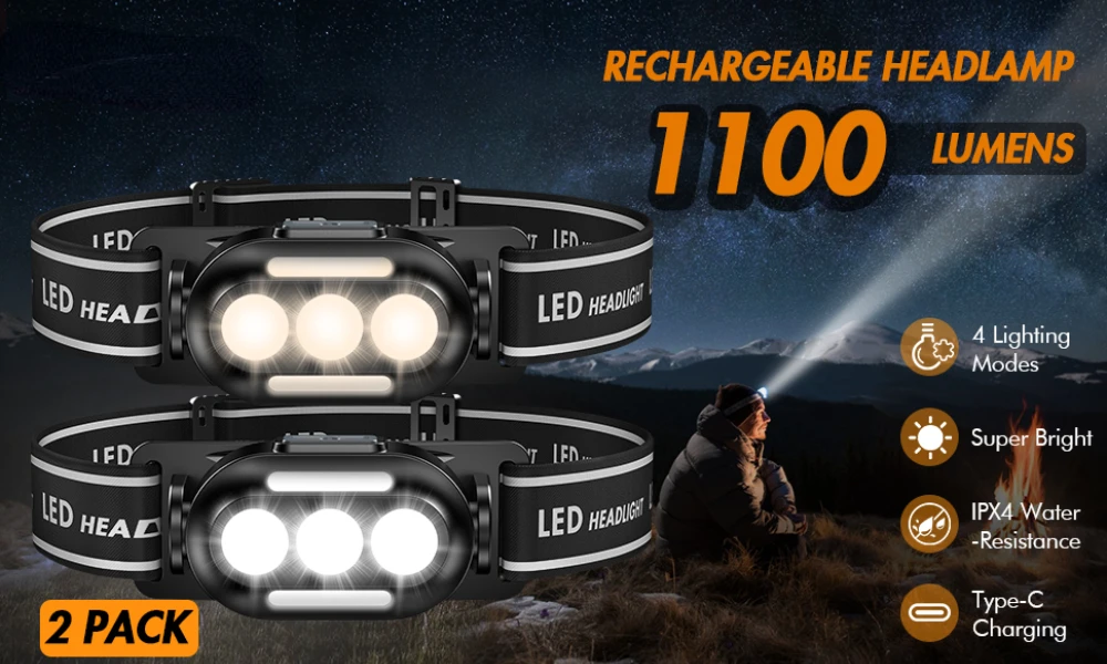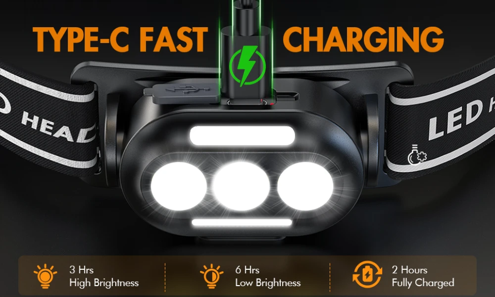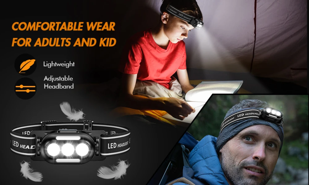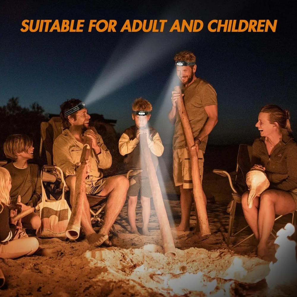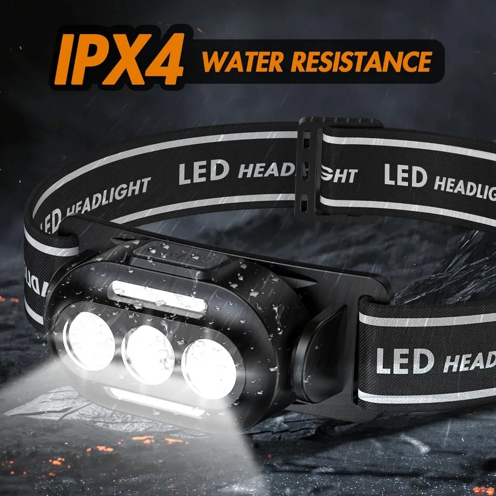 Esta lanterna frontal tem classificação à prova d'água IPX4, adequada para uso em dias de chuva ou neve, em ambientes internos ou externos. Adequado para caminhadas, corrida, camping, caça, pesca, etc.